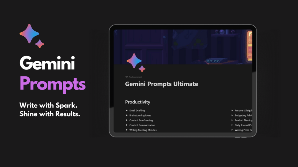 Unlock your full potential with Gemini Bard Prompts, the all-in-one digital companion designed to elevate your productivity across various domains. From email drafting to coding help, resume critiquing to brainstorming ideas, our comprehensive prompts cover it all. Whether you're a professional, student, entrepreneur, or creative mind, Gemini Bard Prompts is your go-to tool for enhancing performance in diverse areas.